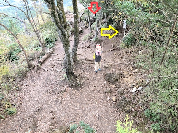 黄色の矢印のところは登ってきた道です。